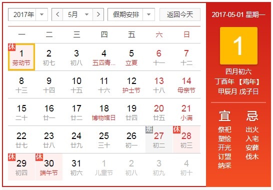 2017年五一勞動節(jié)放假安排:2017年4月29日(星期六) 、4月30日(星期日)、5月1日(星期一) ,共休3天